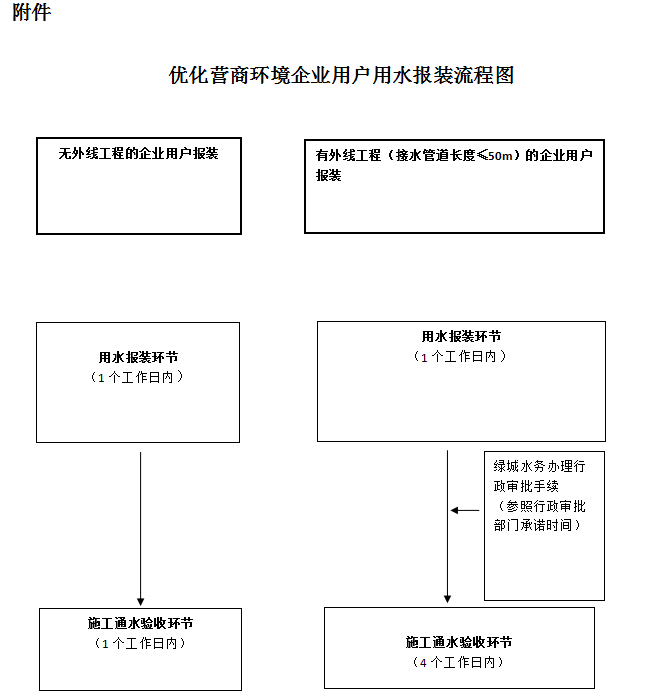 2.施工通水驗(yàn)收環(huán)節(jié):無外線工程施工通水驗(yàn)收時(shí)間不超過1個(gè)工作日,有外線工程(外線工程長(zhǎng)度≤50m)施工通水驗(yàn)收時(shí)間不超過4個(gè)工作日,不包含辦理行政審批手續(xù)時(shí)間。
