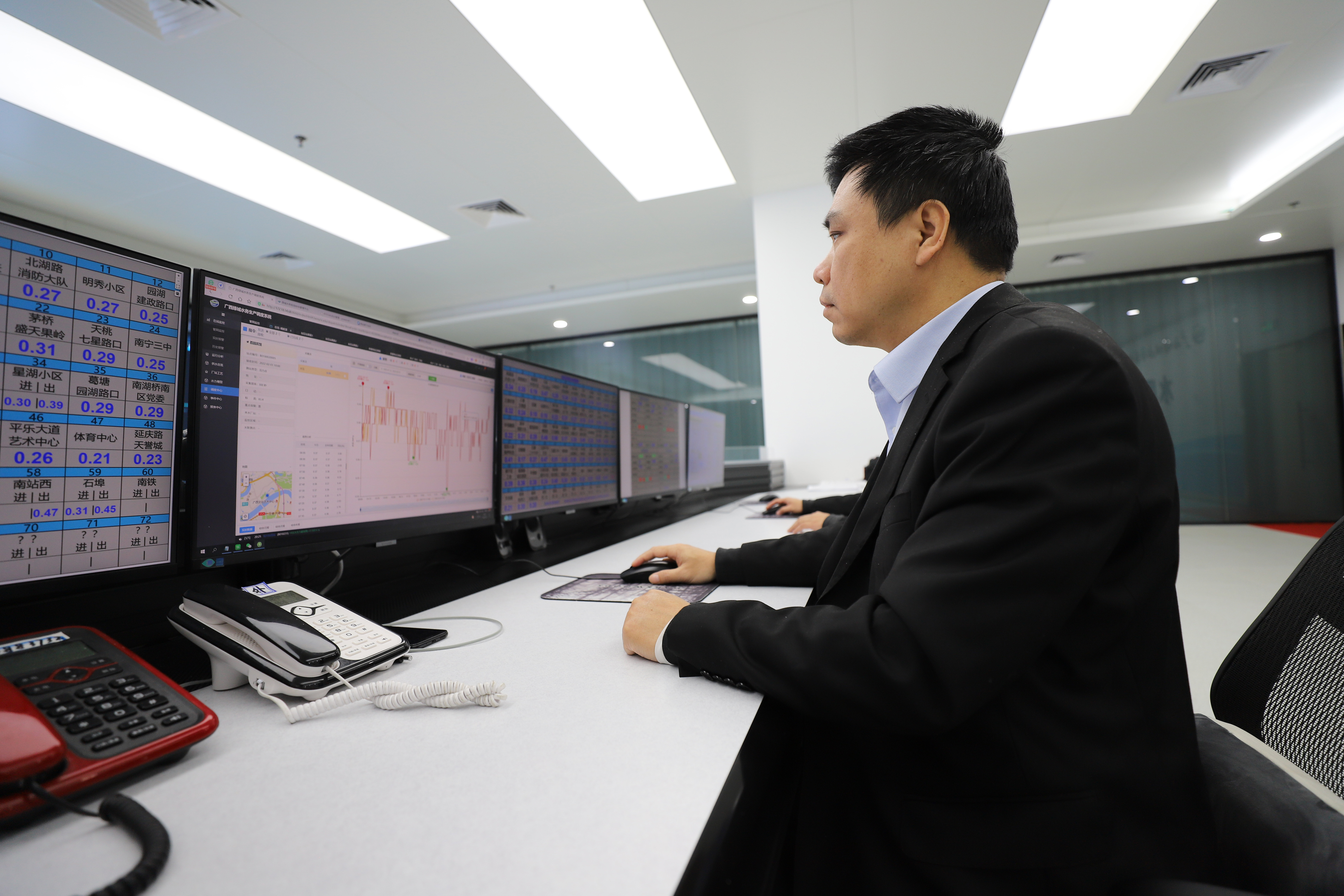 2月1日大年初一,廣西綠城水務股份有限公司(簡稱“綠城水務”)調(diào)度檢測中心大樓內(nèi),已經(jīng)連續(xù)第二天來值班的調(diào)度員謝毅早早就坐在水務調(diào)度中心的監(jiān)控臺前,仔細查看全市各測壓點的每個數(shù)據(jù)。謝毅介紹,春節(jié)期間很多人回鄉(xiāng)過年,用水量比平日減少,水壓變化大,他們需要根據(jù)生產(chǎn)調(diào)度系統(tǒng)上的水壓變化進行預判,及時相應做調(diào)節(jié)措施,確保城市水壓能夠達到合理均衡的狀態(tài)。