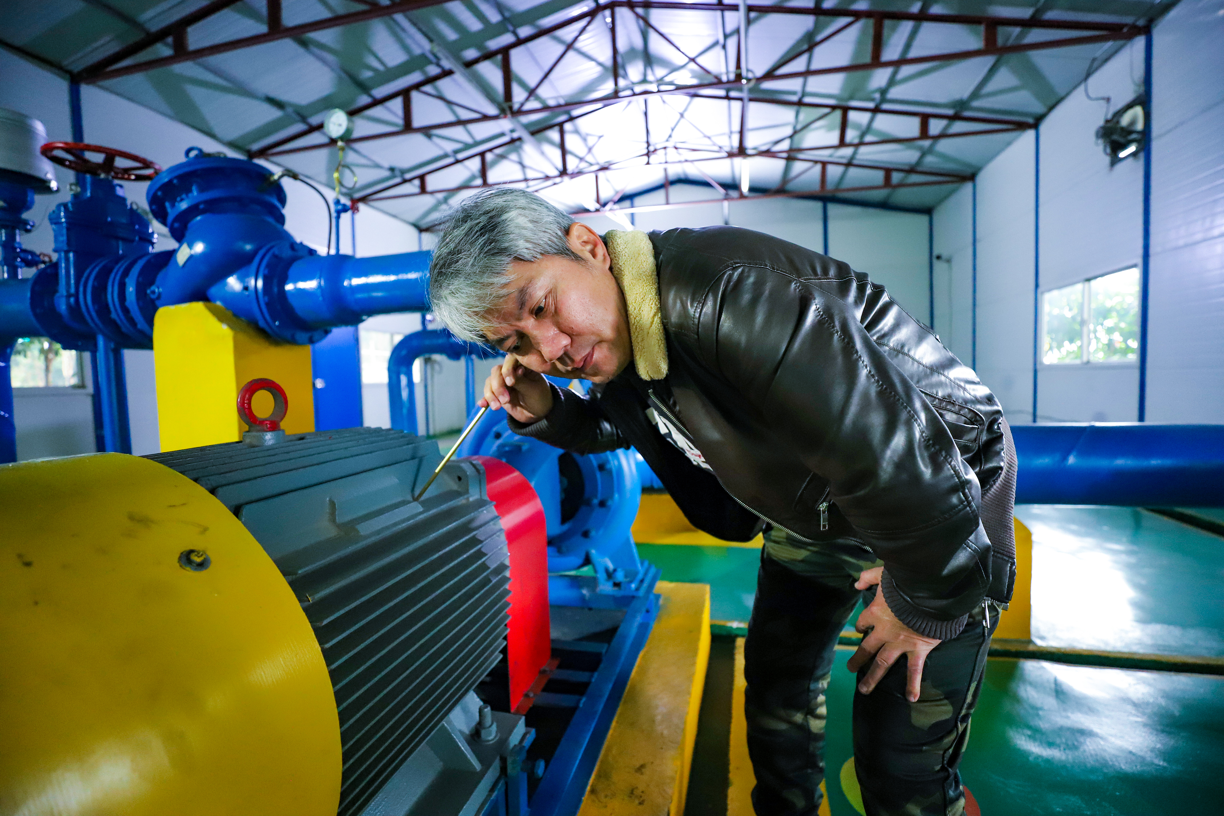 在位于柳沙半島的柳沙加壓站里,凌鐵水廠巡檢員覃陽打開手機的APP告訴記者,公司建立的生產(chǎn)調(diào)度系統(tǒng)可以通過手機隨時查看公司整個水壓點的情況。今天早上,他看到APP上的數(shù)據(jù)有一點異常,就馬不停蹄趕到現(xiàn)場排查情況。在泵房里,覃陽仔細查看了泵站出口水壓和入口水壓,又從墻上拿起一根金屬材質(zhì)的棍子,像醫(yī)生拿著聽診器聽診一樣將棍子放在加壓泵上,覃陽介紹,聽棍的作用是排查機器運轉(zhuǎn)過程中是否存在異響,從而判斷故障位置,及時維護保養(yǎng)。經(jīng)過一番調(diào)節(jié)操作,泵房出水口的水壓慢慢地變成正常值,覃陽舒了一口氣,說道:“這個加壓站的正常運行關系著千家萬戶的用水穩(wěn)定,安全供水一刻也不能松懈”。