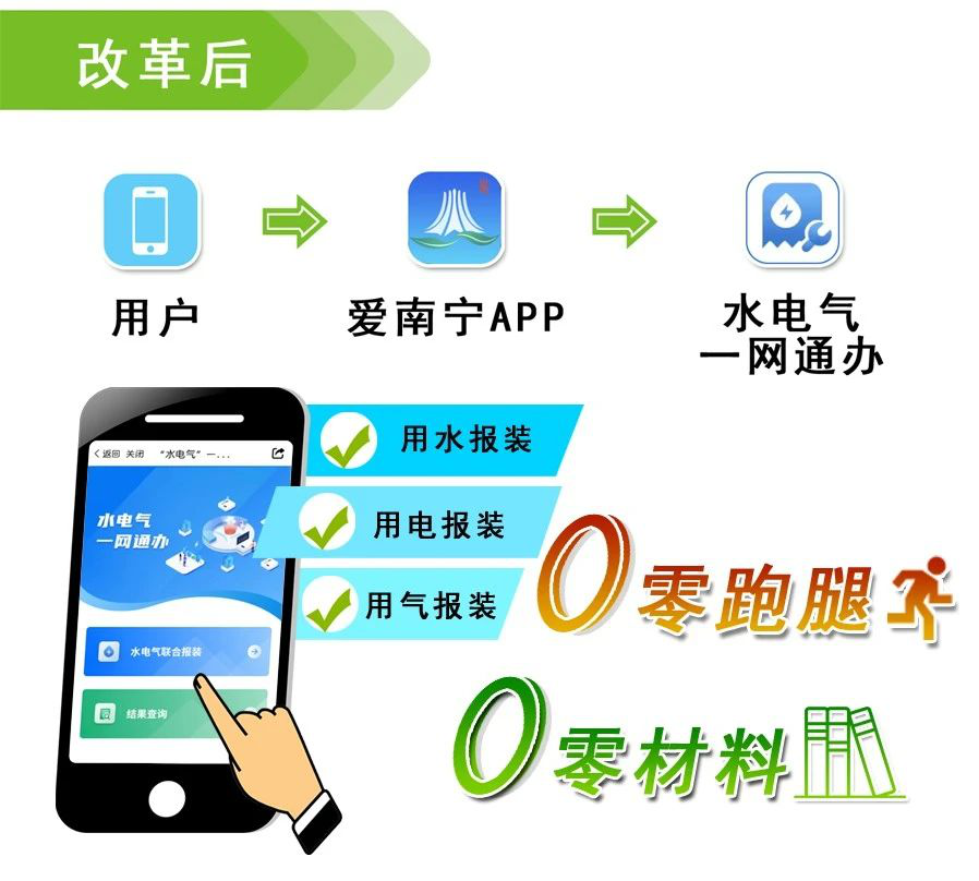 此前,南寧已在全區(qū)率先實(shí)現(xiàn)水電氣業(yè)務(wù)線下“一窗通辦”,市縣兩級(jí)政務(wù)服務(wù)中心設(shè)立了“水電氣”業(yè)務(wù)受理專窗,實(shí)行“一窗受理”“并聯(lián)審批”模式,一個(gè)窗口即可同時(shí)辦理水電氣三家企業(yè)的業(yè)務(wù)。但群眾報(bào)裝水電氣需到政務(wù)服務(wù)大廳或線下營(yíng)業(yè)廳,或分別登錄供電、供水、供氣的APP/小程序進(jìn)行申請(qǐng),線下跑、反復(fù)提交材料、多次登錄的問題仍然存在。