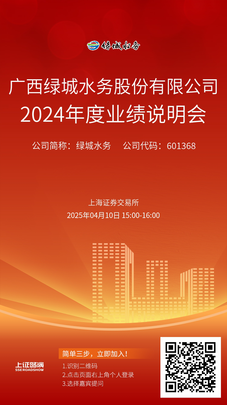 廣西綠城水務股份有限公司(以下簡稱“公司”)計劃于2025年04月10日(星期四)15:00-16:00舉辦2024年度業(yè)績說明會,在信息披露允許的范圍內(nèi),就公司2024年度經(jīng)營發(fā)展情況與投資者進行互動交流與溝通。